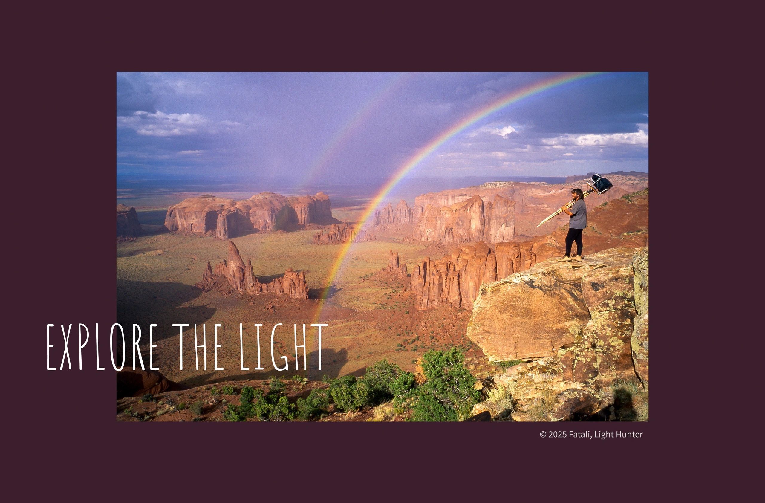 The name "Light Hunter" was given with honor to Fatali by the Navajos back in the early 80's when he first explored and helped discover slot canyons bordering Northern Arizona-Southern Utah. These sacred canyons, like the now famous Antelope Canyon, Navajo Nation Tribal Park, became his cathedrals of stone as a sanctuary for solace during his spiritual healing as a teenager. This slot canyon, before it's popularity, was only accessed by those who rappelled by ropes and who dared entering the unknown deep sandstone abyss. This was the beginning of his intimate relationship with the canyons, its people and the Light.